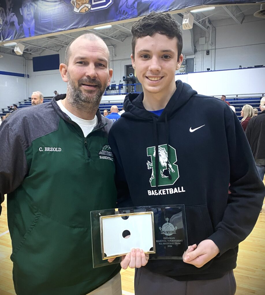 Caleb Clark, shown here with Coach Curtis Bezold, was selected as our representative to the Northern Kentucky Freshman Tournament All-Tournament Team